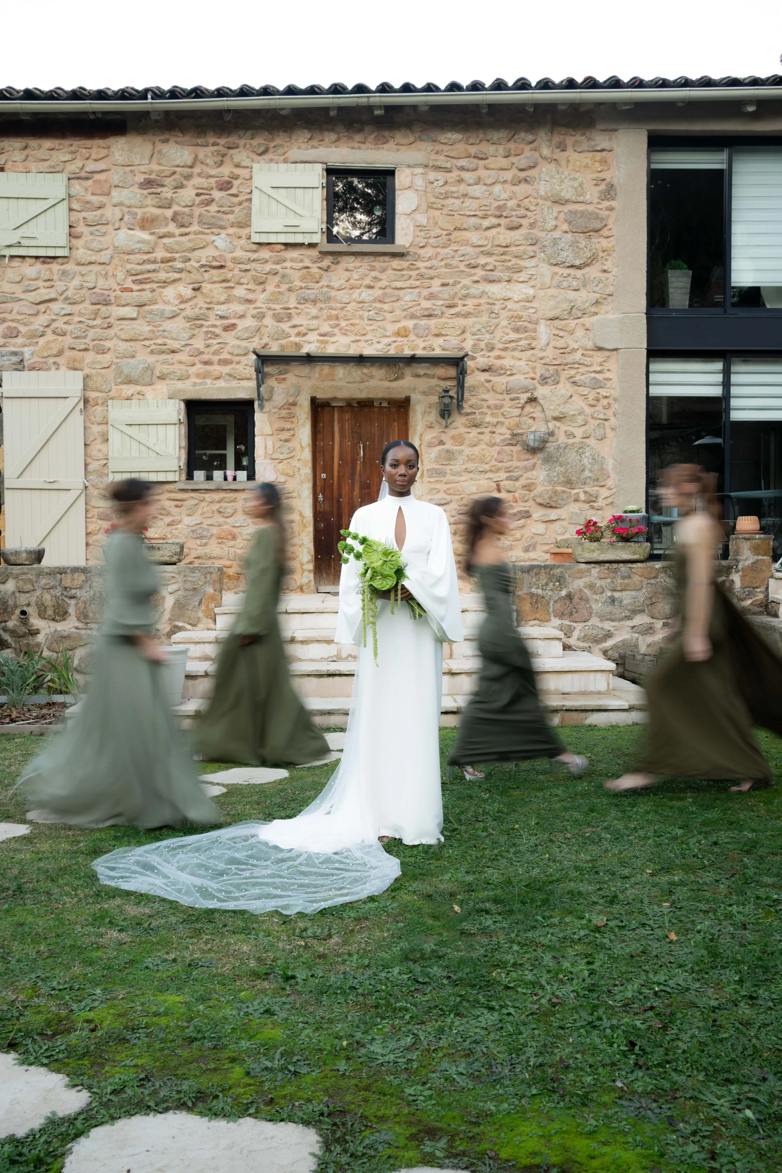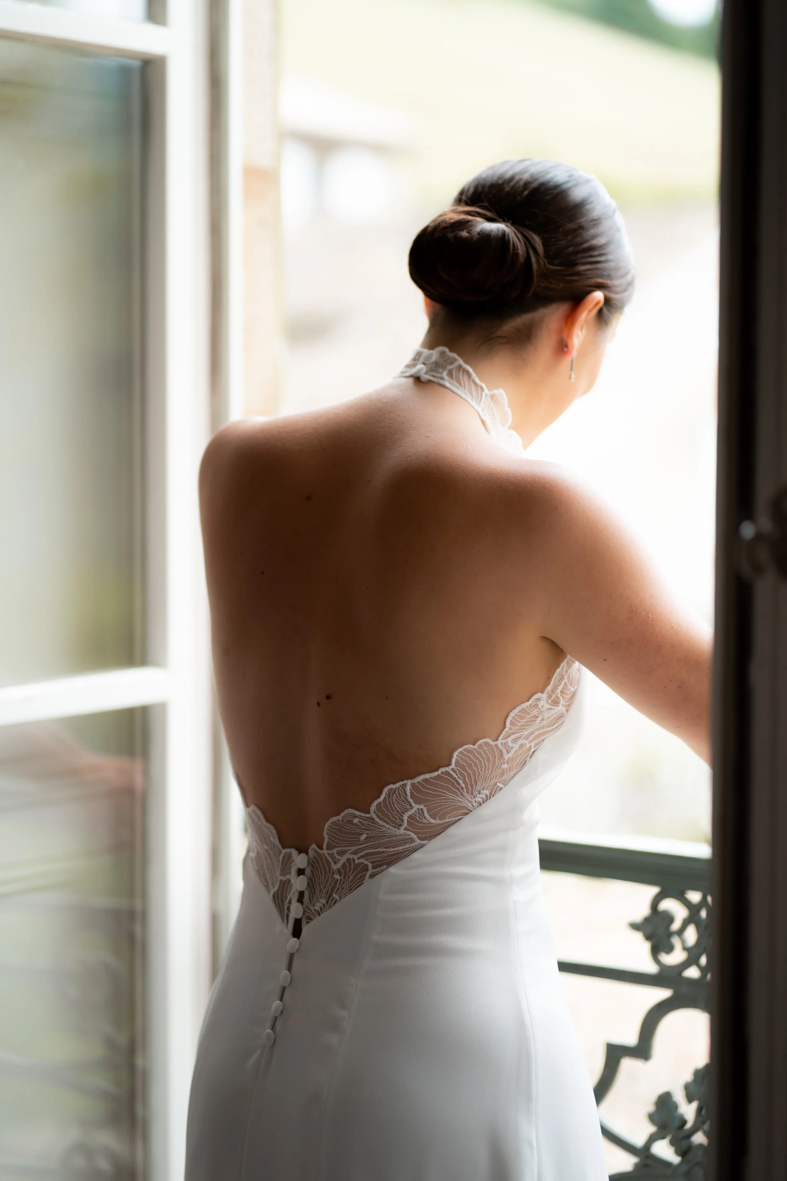 Chaque robe est entièrement réalisée sur mesure dans notre atelier en périphérie lyonnaise, alliant savoir-faire traditionnel et exigence du détail.